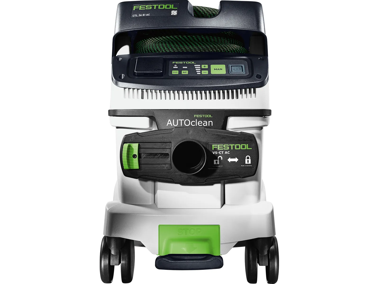 Palyginti su pirmtakais, CLEANTEC CTM 26 EI AC pasižymi efektyvesniu AUTOCLEAN pagrindinio filtro valymu. Tai užtikrina nuolat didelę siurbimo galią, ilgesnius eksploatavimo intervalus ir ilgesnę filtro naudojimo trukmę rečiau atliekant techninės priežiūros darbus. Intuityvus jutiklinis siurblio valdymas. Su integruota „Bluetooth®“ sąsaja, skirta automatiškai siurbliui paleisti per akumuliatorinį „Festool“ įrankį arba pasirinktinį nuotolinio valdymo pultą. Jūsų siurblys taip pat yra susietas su „Festool“ programėle, kurioje galima nustatyti, pvz., valymo intervalus. Lygią, antistatinę siurbimo žarną galima praktiškai paslėpti integruotame žarnos dėkle.