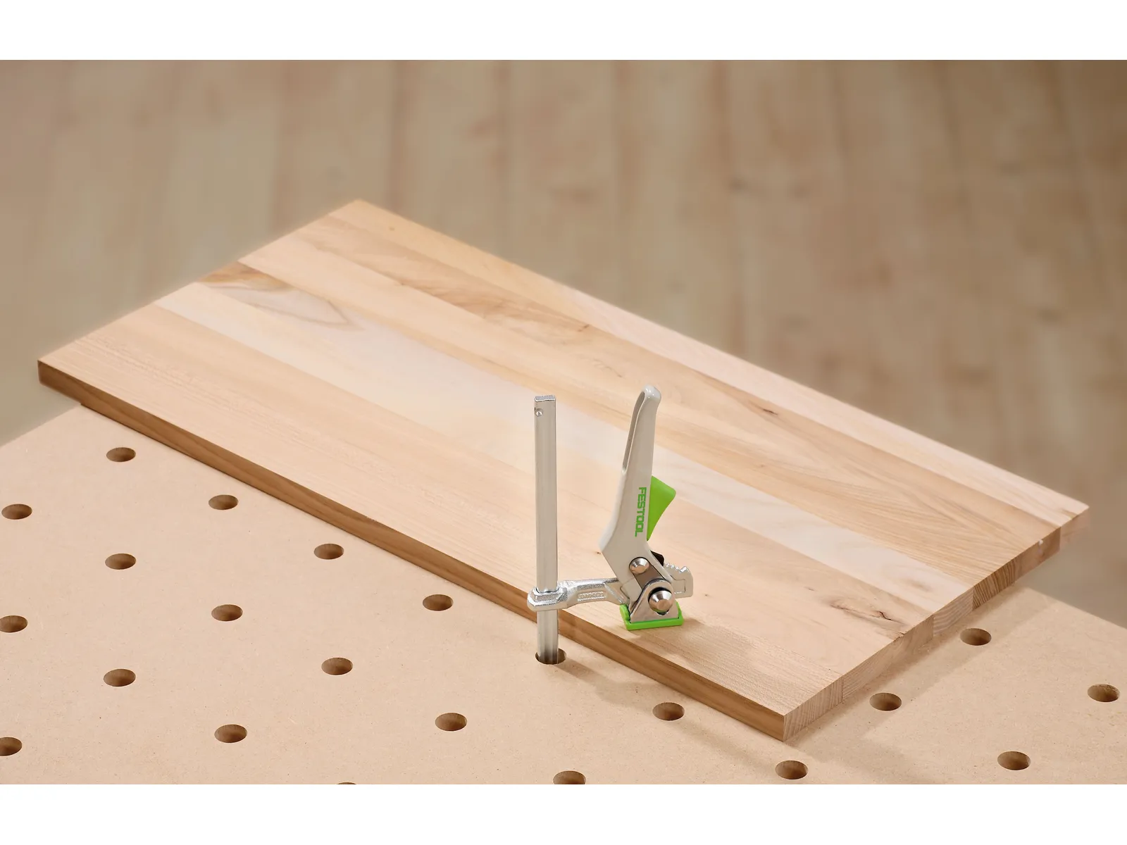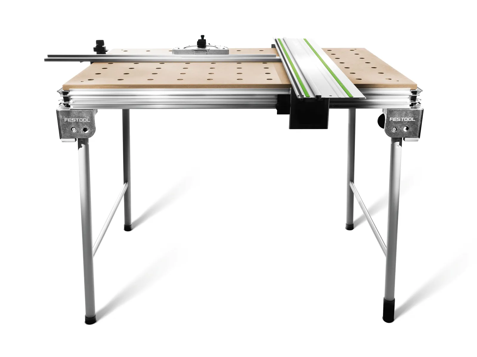 Daugiafunkcį stalą galima komplektuoti tinkamais reikmenimis priklausomai nuo naudojimo atvejo: tiek kreipiančioji liniuotė, tiek ir kombinuotas kampų šablonas – viskas bus patikimai pritvirtinta ištisiniame profilyje. Patogiam ir saugiam ruošinių fiksavimui ir apdirbimui į perforuotas plokštes gali būti įstatomi suveržikliai, veržtuvai ar spaustukai.