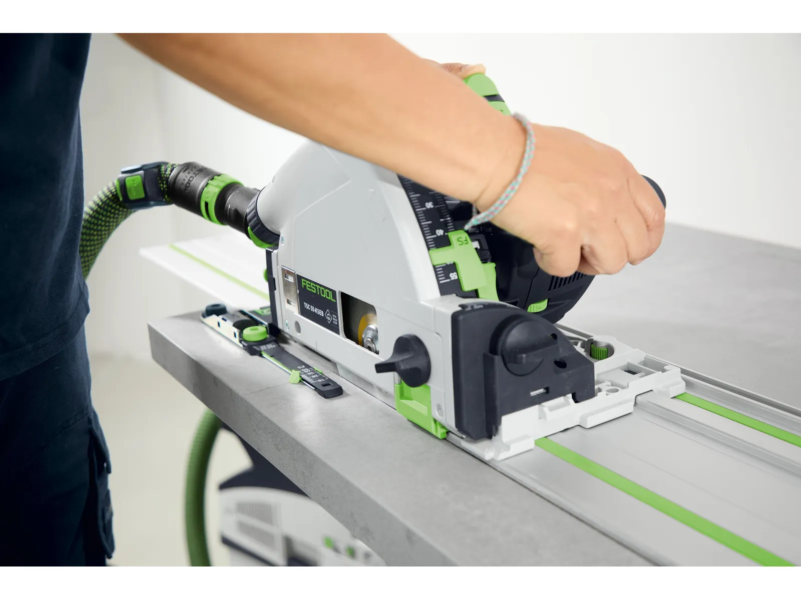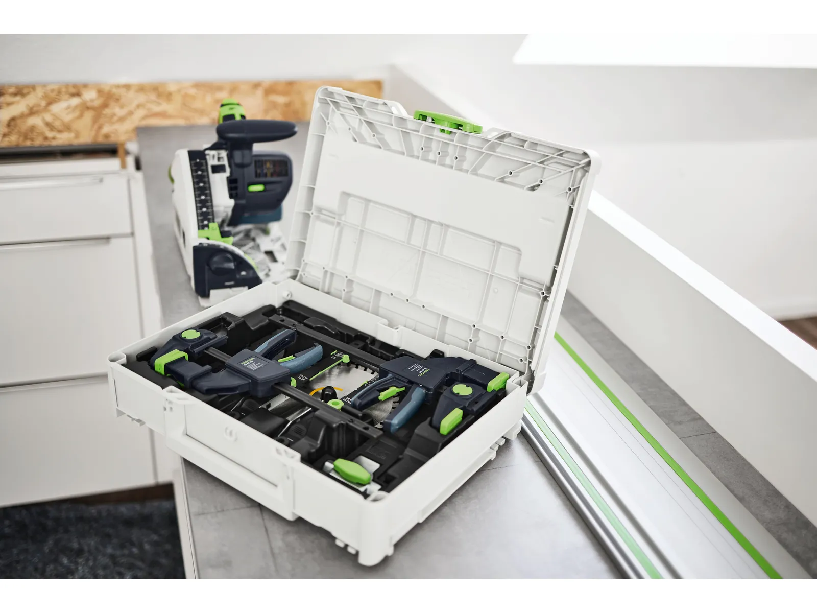 Šis komplektas yra puikus jūsų panardinamojo pjūklo priedas: su panardinamojo pjūklo padėties indikatoriumi galite patikimai pataikyti į tikslų pjūklo ašmenų įėjimo ir išėjimo tašką, esant bet kokiam pjovimo gyliui. Tiesiog įstatykite jį į kreipiančiojo bėgio griovelį iš viršaus ir pritvirtinkite. Tada sureguliuokite žymėjimo indikatoriaus skalę pagal savo įleidžiamojo pjūklo gylio nustatymą, sulygiuokite jį su žymėjimu ir įstatykite išpjovas tiksliai ten, kur reikia. Naudodami suderintus vienos rankos spaustuvus, kreipiamąjį bėgelį prie ruošinio galite pritvirtinti tik viena ranka, kad darbas būtų saugesnis ir labiau kontroliuojamas. Be to, „Systainer” dėkle yra vietos pjūklo diskams ir FS jungtims – kad visada turėtumėte po ranka sistemos priedus.